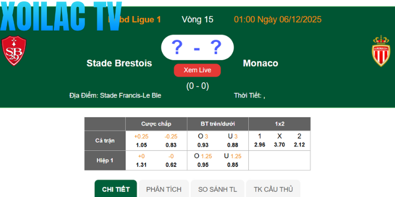 Bảng tỷ lệ kèo trận Brest – Monaco