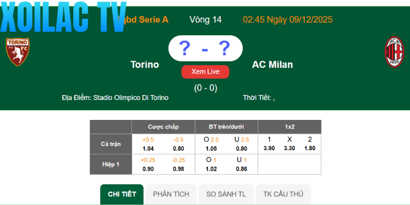 Bảng tỷ lệ kèo trận Torino – AC Milan